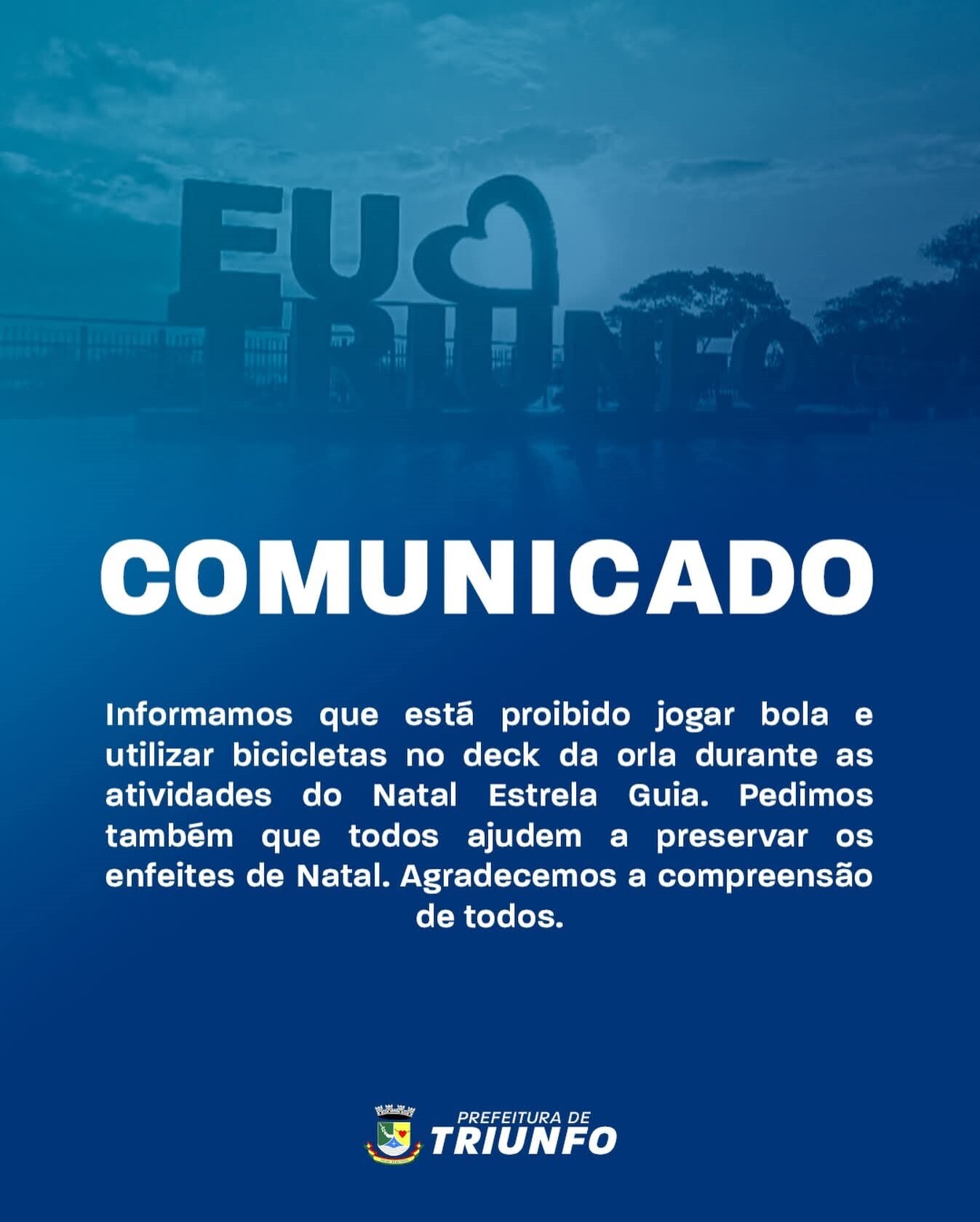 A Administração Municipal informa que está proibido jogar bola e utilizar bicicletas no deck da orla durante as atividades do Natal Estrela Guia. Reforçamos a importância da colaboração de todos para manter os enfeites natalinos em boas condições.