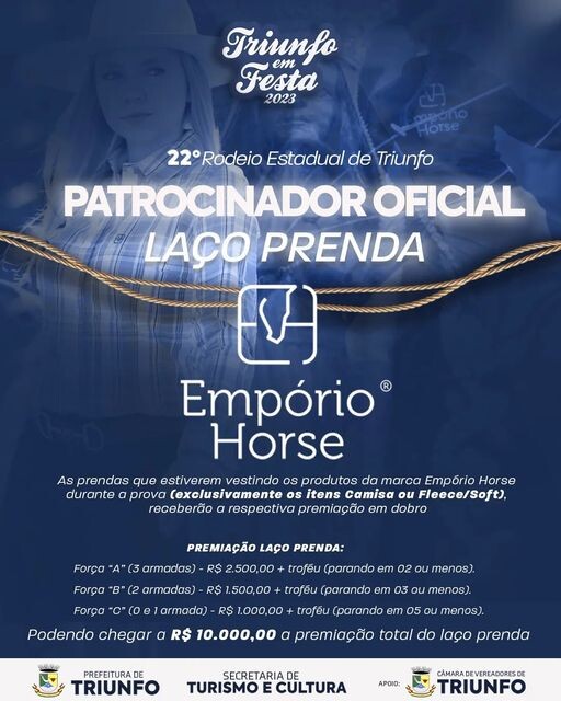 Temos a honra de ter como parceiro do evento a Empório Horse, marca já reconhecida no mundo equestre e que estará mais uma vez presente no Triunfo em Festa 2023.